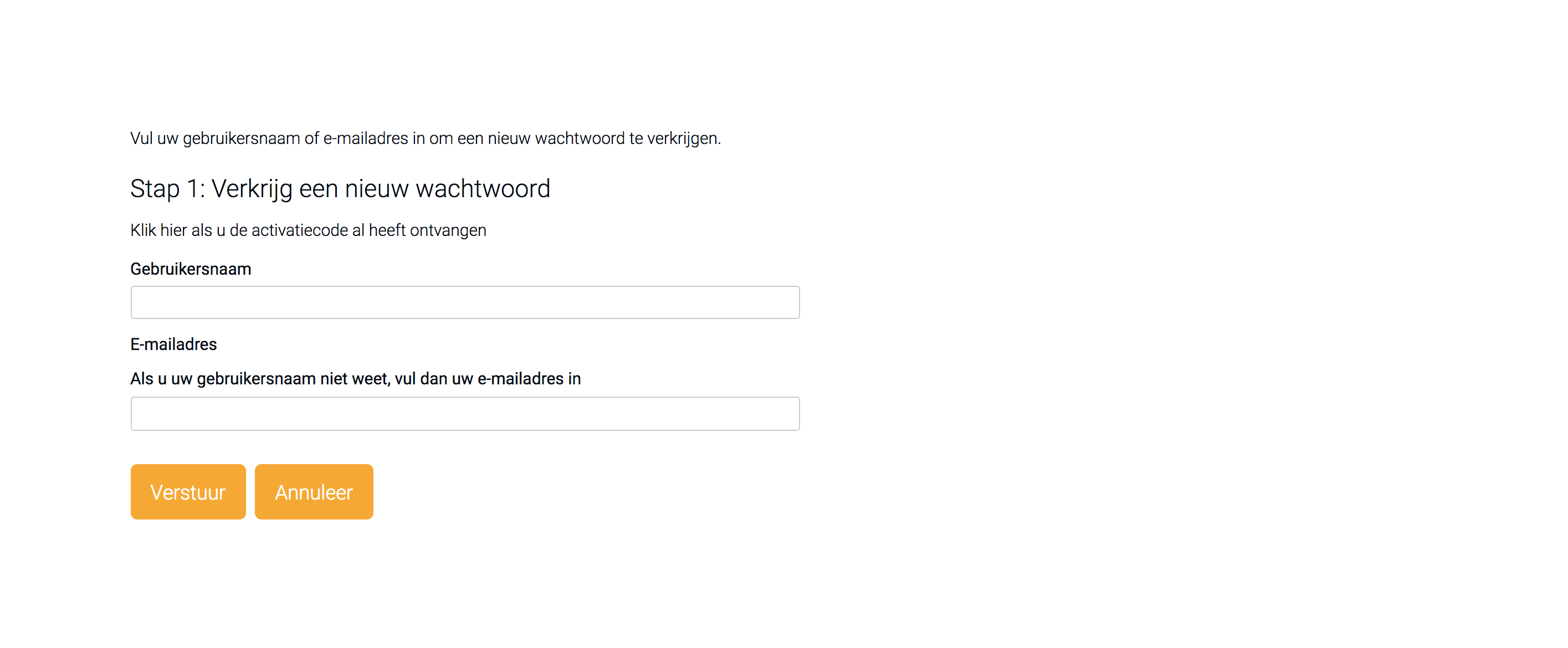 Na het versturen van deze gegevens, zult u binnen enkele minuten een e-mail ontvangen met daarin uw gebruikersnaam en een activatiecode. Deze activitatiecode bestaat uit willekeurige 32 tekens (cijfers, letters en hoofdlettergevoelig) en zal moeten worden aangegeven bij stap 2. Om het een en ander voor u wat eenvoudiger te maken, zal er ook een directe link worden getoond in het bericht. Wanneer u op die link klikt, zal de activitatiecode automatisch worden ingevuld, waardoor u alleen nog een nieuw wachtwoord zult moeten aangeven.