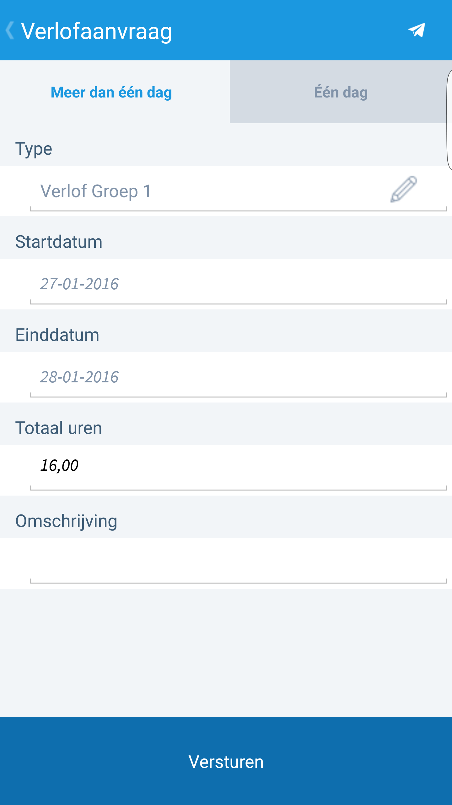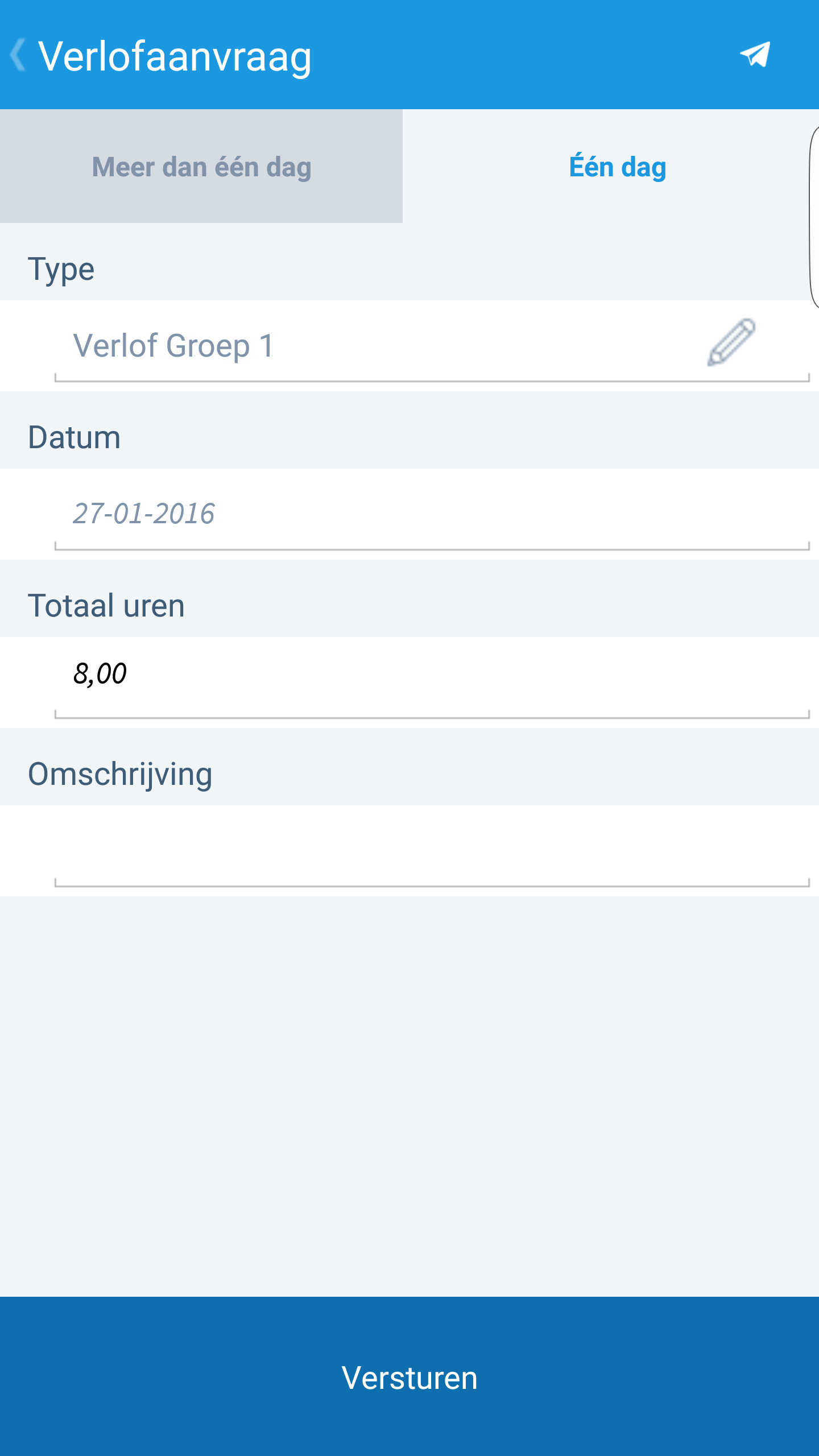 Om verlof aan te vragen druk op 'Versturen' of rechtsboven op het icoon.