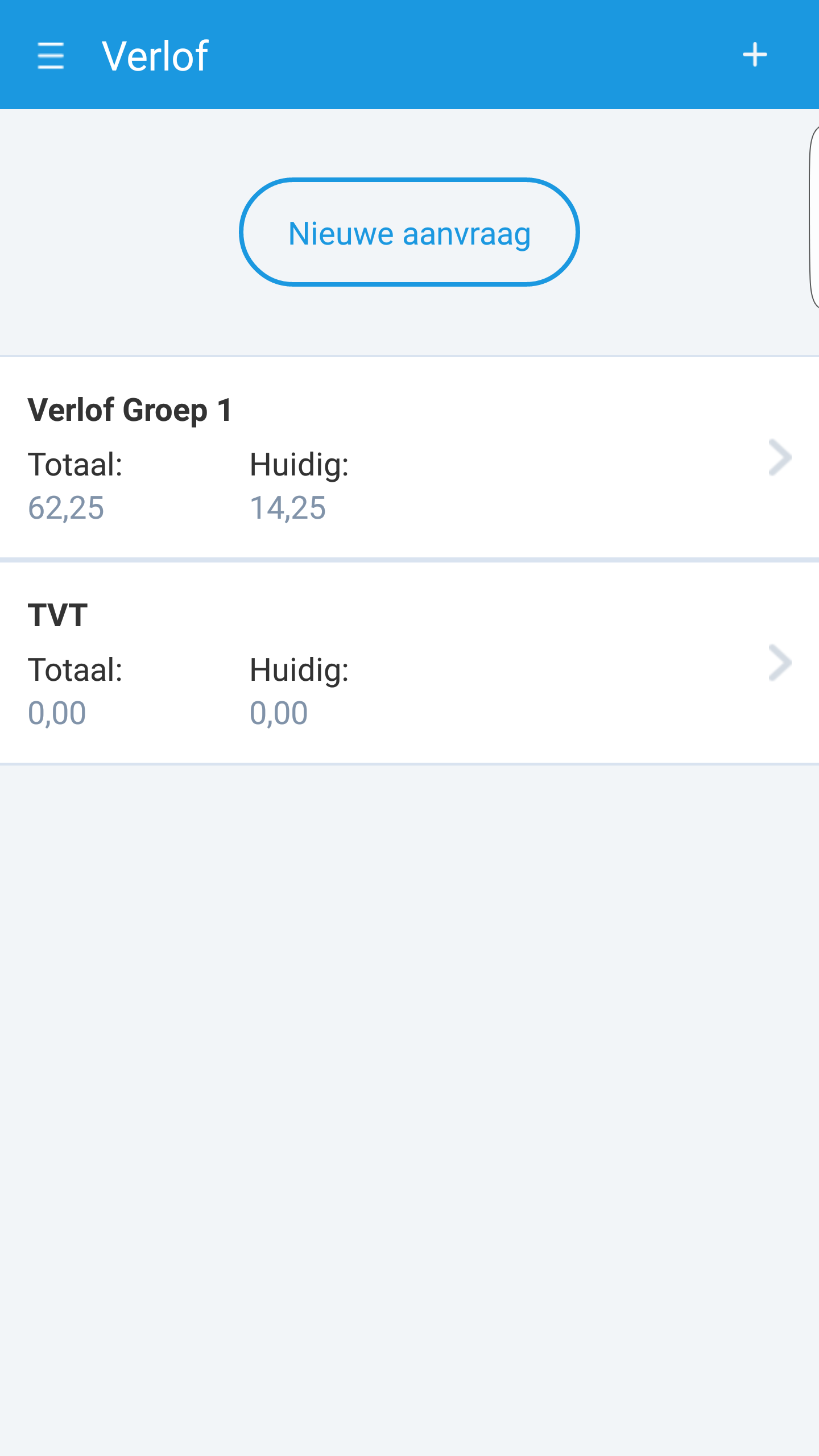 Afhankelijk van de verlofinstellingen van de werkgever ziet u hier 1 of meerdere verlofgroepen. Elke verlofgroep geeft het totaal en de huidige saldo weer.