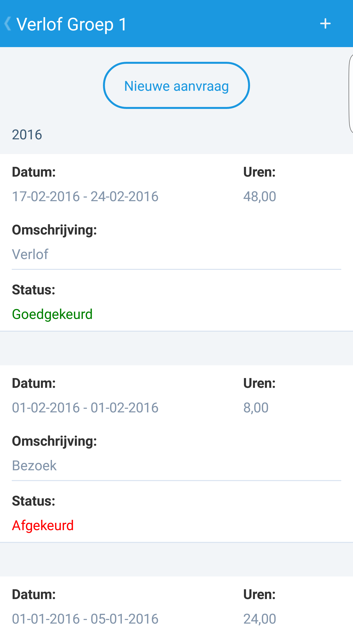 Klik op een verlofgroep en u ziet de status van de verlofaanvraag. Door te schuiven naar links of naar rechts kunt u wisselen tussen de verschillende jaren.